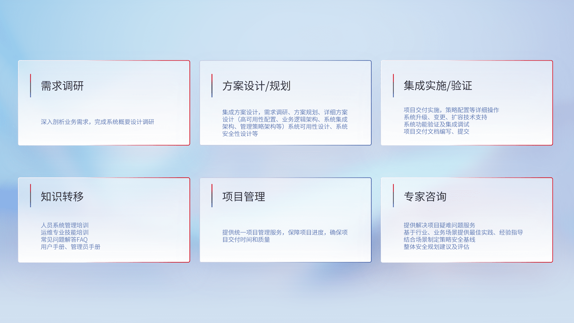 针对客户行业特性,,将宏观的安全战略和需求,,,通过专业的交付服务,,,实现项目落地,,,为客户提供标准规范的集成交付服务。。。。